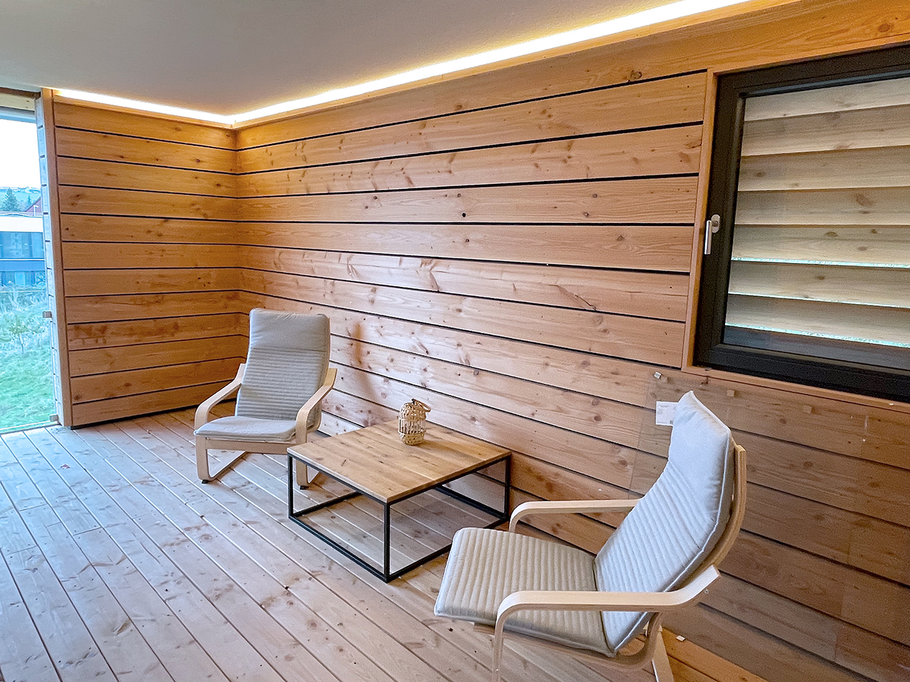 Der heimelige, holzverkleidete Wintergarten verströmt Geborgenheit und ist ein kühler Rückzugsort an heißen Sommertagen.